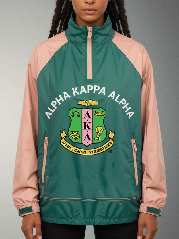 Showcase Greek pride with this Alpha Kappa Alpha Windbreaker, featuring an emerald-cast crest. Perfect for showcasing sorority heritage, it merges style and function perfectly.