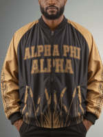Stylish Alpha Phi Alpha raglan windbreaker in striking golden hue, featuring riddle pattern and undeniable fraternity spirit. Lightweight, durable and ideal for layering.