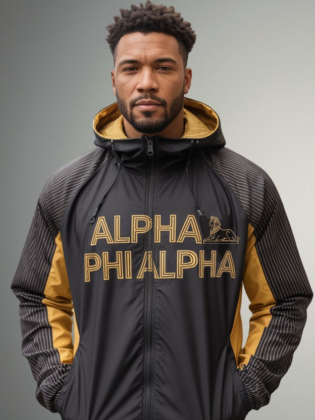 Alpha Phi Alpha Phirst Pham Raglan Windbreaker: showcasing fraternity pride through Greek lettering, golden accents, wind-resistance, and stylish raglan sleeves. Warm, durable, exclusive for members.