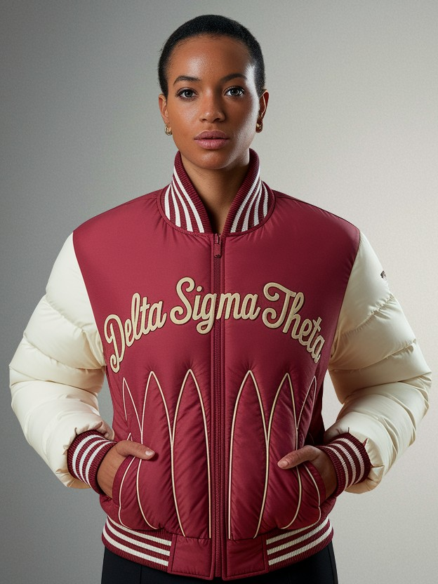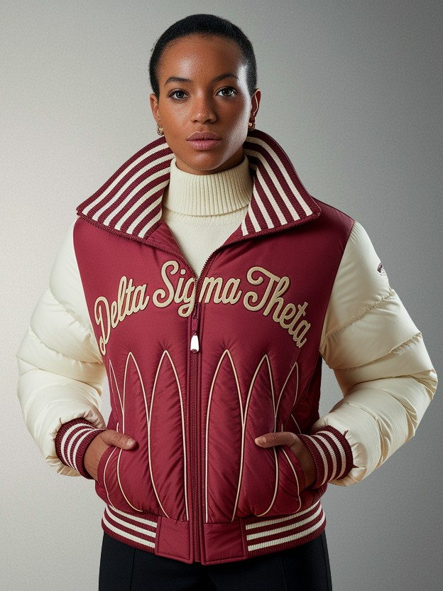 Stay warm and stylish with the Delta Sigma Theta Crimson Torch Puffer Jacket, featuring a cozy design, sorority crest, and distinctive crimson color.
