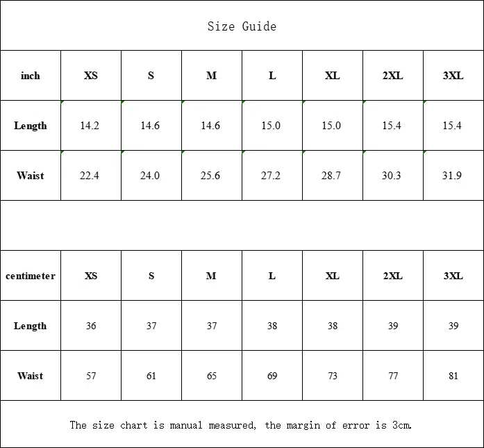 | Waist | 22.4 | 24.0 | 25.6 | 27.2 | 28.7 | 30.3 | 31.9 |