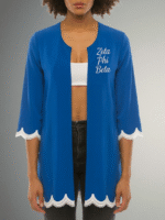 Experience elegance with the Zeta Phi Beta Serene Azure Lace Cardigan; ethereal lace, unique Sorority-specific motifs, versatile Azure color. Perfect for sisterhood events.